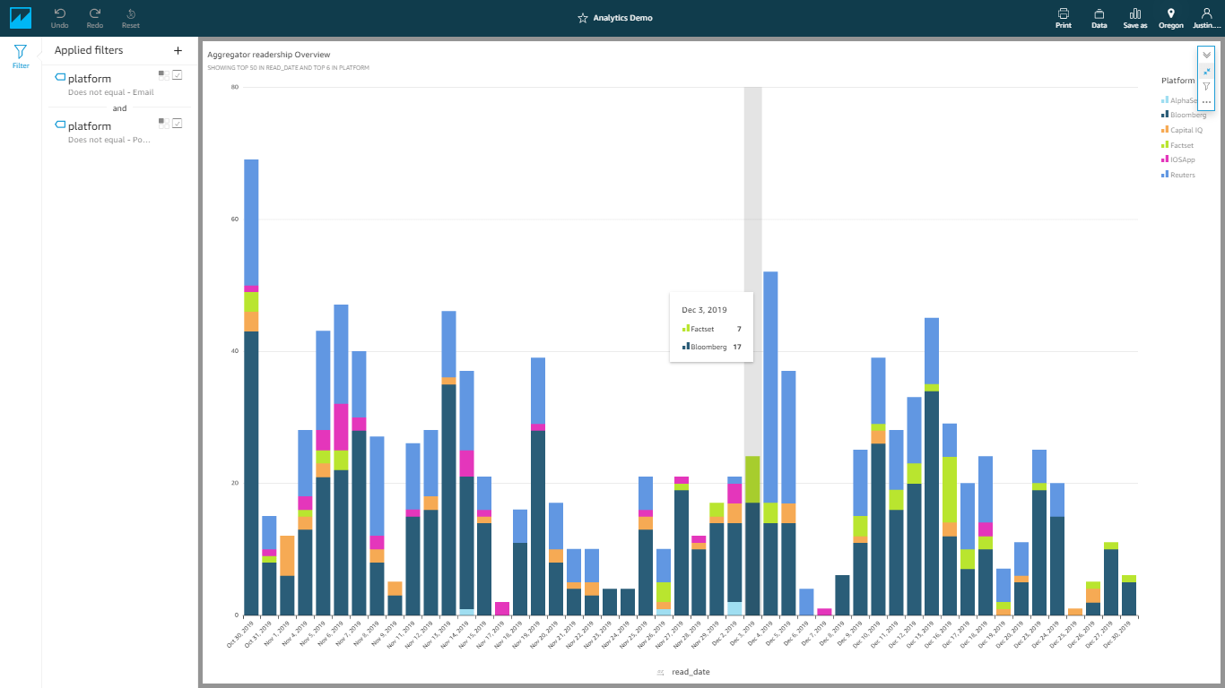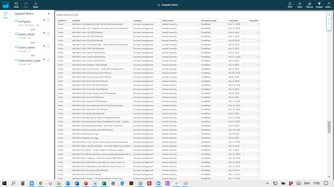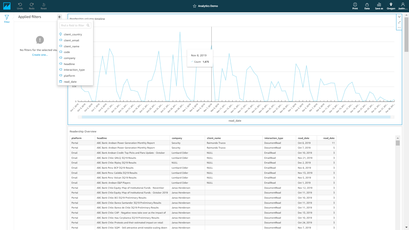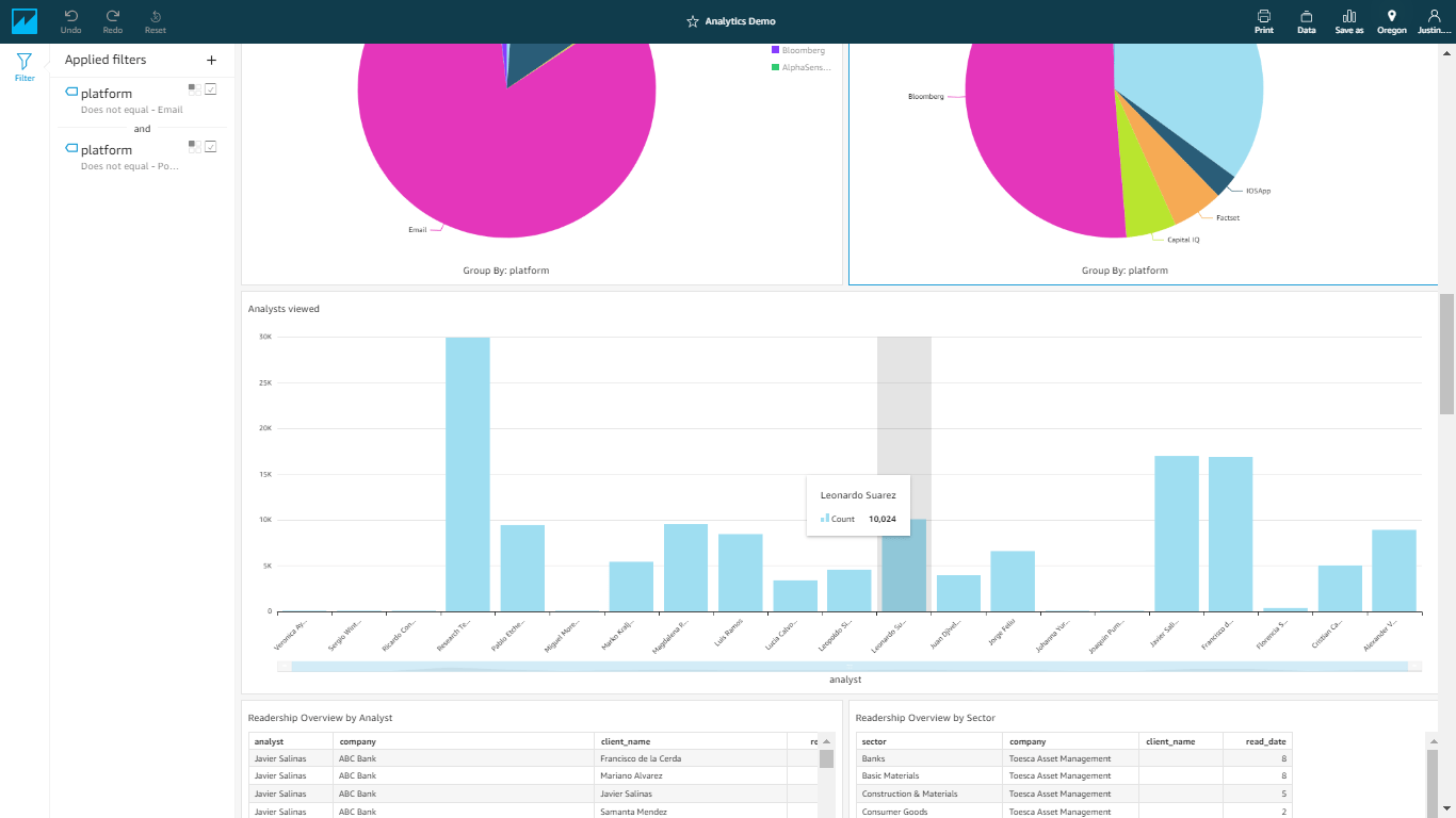 Using real-time user interaction data from your direct channels (Portal, Mobile, eMail) and the weekly/monthly reporting generated by connected vendor destinations; clients access can access their data anytime through a dedicated web dashboard that provides a range of graphic visualization of key research metrics and an extensive ad hoc reporting capability.